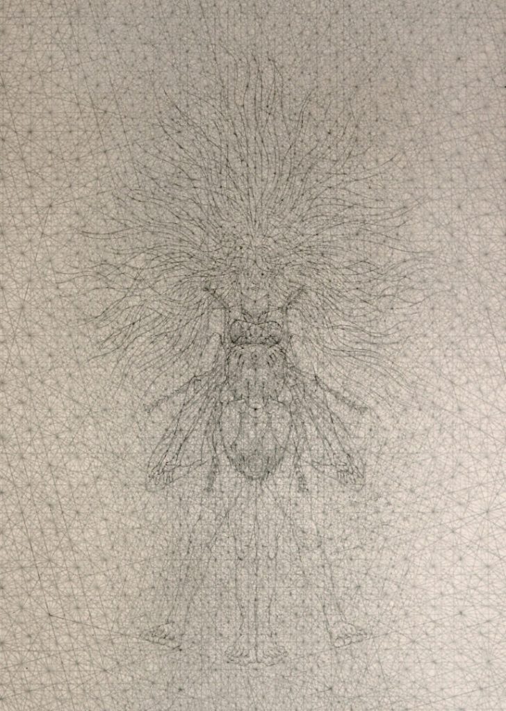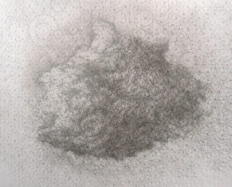 Using a minute crosshatching of geometry, my recent drawings aim to crisscross time and space in search of interconnectivity. They seek a singularity between our present time and distant past and between where we live and originate from.