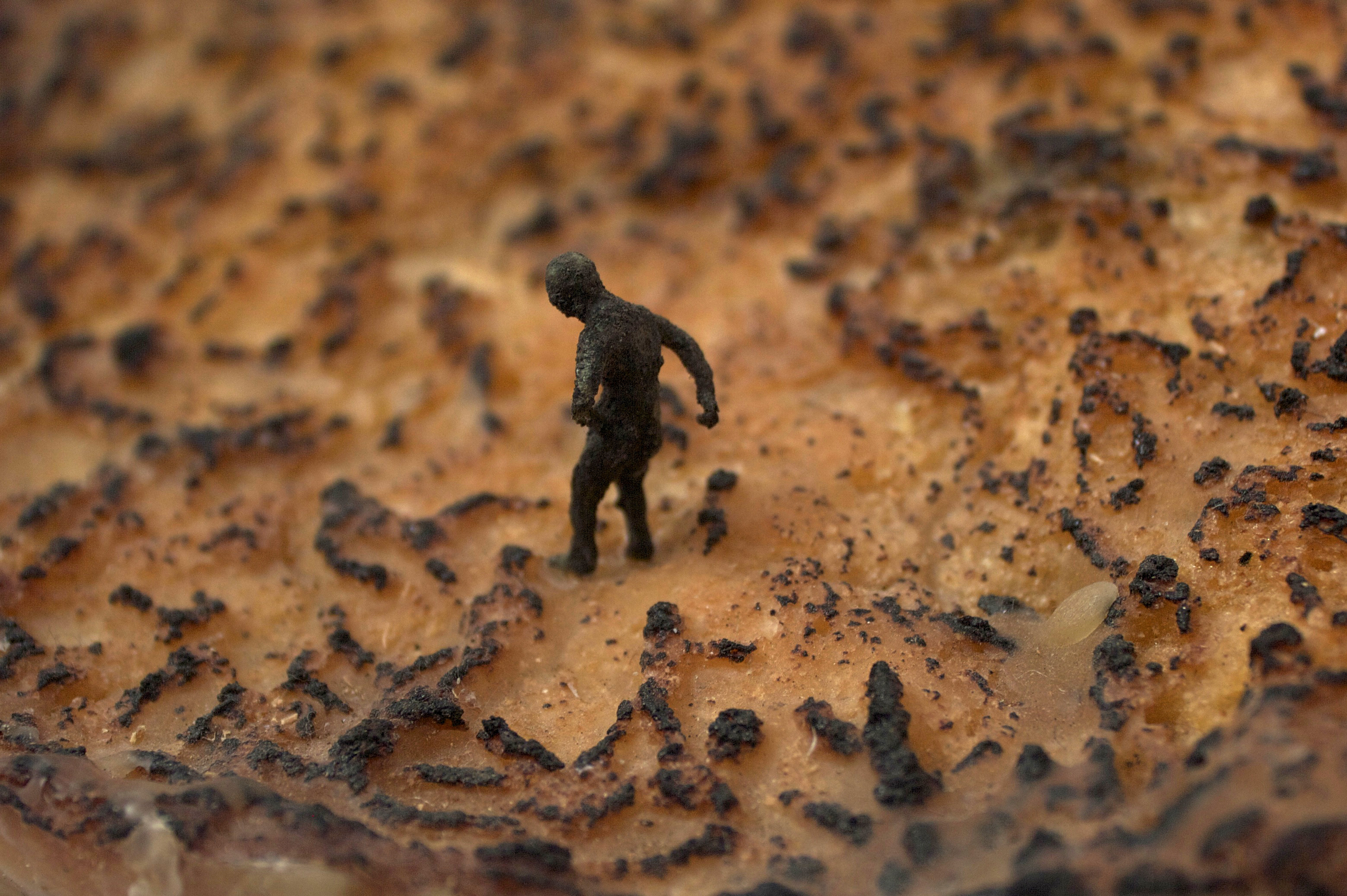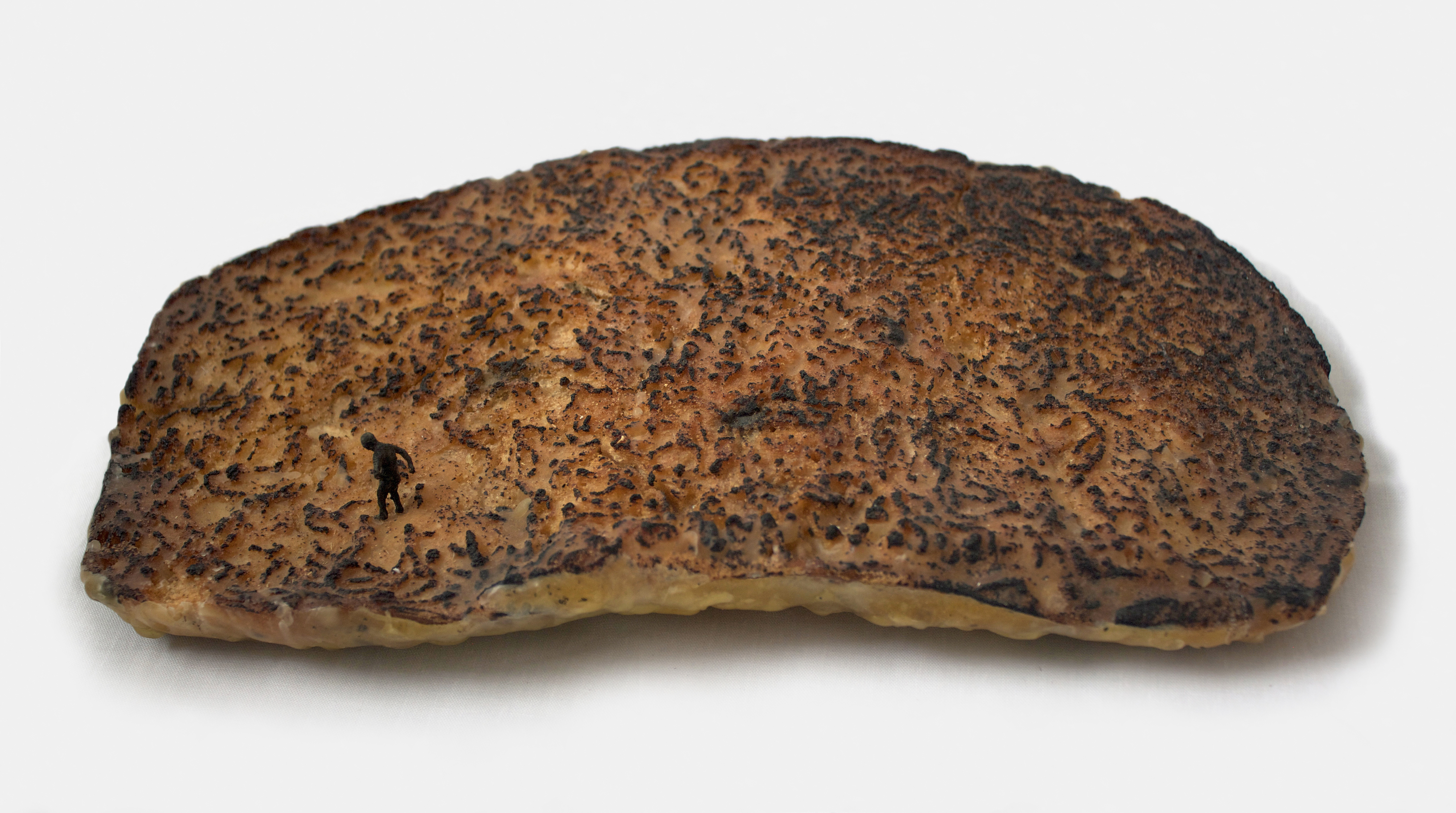 Having burnt some toast one day I stumbled on the idea of working with the charred remains. Incredibly, there have been many archaeological finds of ancient loaves and remains of bread, some older than 4000 years. Ancient breads were either charred or desiccated, which explains their long state of preservation. With Hell on Toast I has carefully excavated a multitude of charred figures from the surface. The standing figure was added later in 2016. Bread, usually a symbol of sustenance, becomes in this piece a barren landscape scattered with charred human remains.