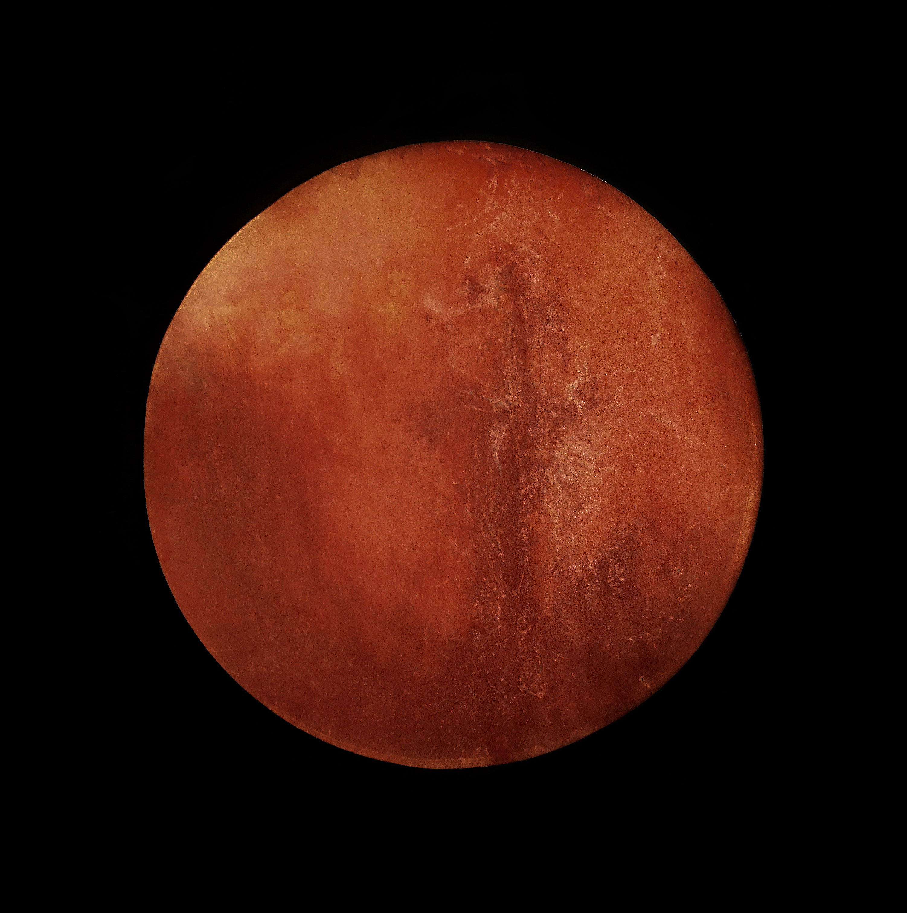 THE RED PLANET, 2019 | Iron oxide, chalk & pastel on found stipple engraving | 285 mm diameter shadow float mounted on black board 470 x 470 mm